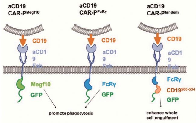 研究證明,表達(dá)Megf10或FcRv胞內(nèi)結(jié)構(gòu)域的CAR-P可促進(jìn)對靶抗原的吞噬能力。CAR-PMegf10可以特異性地觸發(fā)對靶向配體的吞噬作用,通過酪氨酸磷酸化的局部信號級聯(lián)反應(yīng)啟動吞噬,TCR-CD3ζ可能通過招募syk激酶而促進(jìn)CAR-P的吞噬作用。