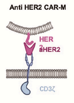 賓夕法尼亞大學(xué)的研究人員使用含有CD3-ζ胞內(nèi)結(jié)構(gòu)域的抗HER2的CAR-M。在兩種實體瘤移植的異位小鼠模型中,單次注射抗HER2-CAR-M可降低腫瘤負(fù)荷,延長小鼠存活時間。在人源化小鼠模型中還發(fā)現(xiàn), HER2-CAR-M能夠?qū)2巨噬細(xì)胞轉(zhuǎn)化為M1巨噬細(xì)胞,誘導(dǎo)炎癥性腫瘤微環(huán)境,增強T細(xì)胞的抗腫瘤細(xì)胞毒性。此外,還發(fā)現(xiàn)HER2-CAR-M可能產(chǎn)生表位擴(kuò)散,為避免腫瘤免疫逃逸提供了新思路。
