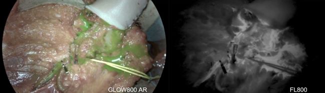 圖1:使用ICG熒光攝像頭GLOW 800(左側(cè))和熒光輔助血管造影術(shù)FL800(右側(cè))檢查血液流動(dòng)。