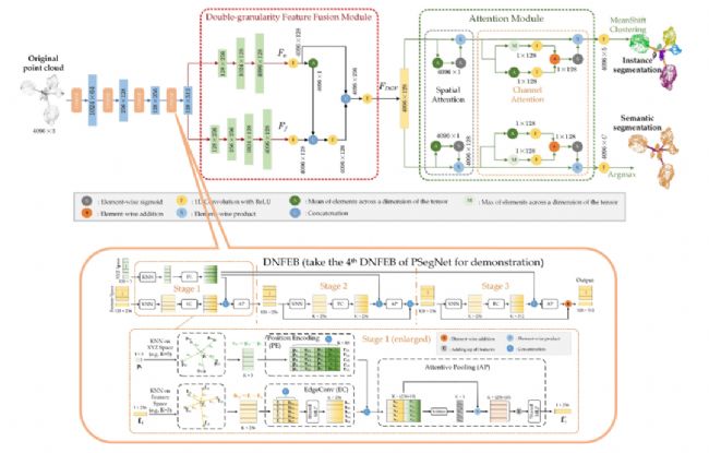 為了解決這些難題,本研究論文做出了如下貢獻:(1)提出了一種體素化最遠點降采樣策略(VFPS)對作物點云進行預處理(流程見圖1)。該策略綜合了體素化點云降采樣和最遠點采樣的優(yōu)勢,具有點數固定、空洞少、可擴增訓練樣本、可進一步提升深度學習網絡性能的特點;(2)人工標注了一個包含了三個品種共幾百株作物點云的數據集用于深度學習網絡的訓練,該數據集囊括了單子葉作物(高粱)和雙子葉作物(煙草、西紅柿),點云標簽包含器官語義標簽與葉片實例標簽;同時,借助體素化最遠點降采樣策略對該數據集進行了高達十倍的訓練數據擴增;(3)設計了一種適用于單子葉作物和雙子葉作物點云分割的雙功能網絡—PSegNet(見圖2)。該網絡可以同時實現莖干和葉片區(qū)域的語義分割以及單葉的實例分割,其主要結構中包含了全新設計的雙鄰域特征提取塊(DNFEB),雙粒度特征融合模塊(DGFFM),注意力模塊(AM)等計算模塊;(4)不僅在作物點云上進行了訓練與測試,還在S3DIS這類大規(guī)模室內場景點云數據集上驗證了PSegNet的有效性,證明了本文深度學習網絡具有強數據適應性和多行業(yè)應用潛力。