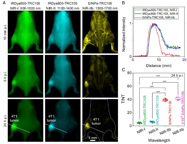 TRC105是一種人源化的處于臨床階段的單克隆抗體,可與內(nèi)皮糖蛋白CD105結(jié)合,故可于高CD105表達(dá)的人類(lèi)和小鼠腫瘤血管特異性結(jié)合。作者將TRC105分別與I期臨床試驗(yàn)熒光團(tuán)IRDye800CW和ErNPs結(jié)合,形成IRDye800抗體結(jié)合物(IRDye800-TRC105)和ErNPs抗體結(jié)合物(ErNPs-TRC105)(圖1B)。IRDye800-TRC105作為對(duì)照物在NIR-I和NIRII成像,ErNPs-TRC105在NIR-IIb區(qū)成像(1500-1700nm),激發(fā)波長(zhǎng)為940nm(圖1C)。