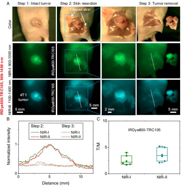 圖3.(A)(上)手術(shù)期間記錄的彩色圖像。靜脈注射IRDye800-TRC105 24小時(shí)后4T1腫瘤切除的NIR-I熒光成像(中)和NIR-II熒光成像(下)(B)沿圖A中虛線的歸一化熒光強(qiáng)度分布(C)NIR-I和NIR-II下Dye800-TRC105的T/M
