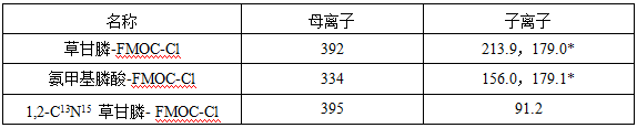 3)儀器條件優(yōu)化,草甘膦和氨甲基磷酸受基質(zhì)抑制影響嚴(yán)重,靈敏度低的儀器在優(yōu)化時(shí)很難找到相應(yīng)的母離子,此時(shí),可直接參考文獻(xiàn)或者標(biāo)準(zhǔn)輸入同類型儀器的參數(shù)。