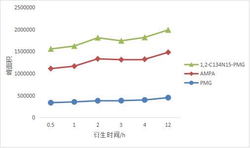 考察不同衍生時(shí)間,0.5~4小時(shí)(衍生溫度40℃)及12小時(shí)(室溫過(guò)夜20 ℃)。結(jié)果如圖3所示,草甘膦和氨甲基磷酸在衍生時(shí)間≥2小時(shí),目標(biāo)物峰面積無(wú)明顯變化,室溫過(guò)夜有利于衍生完成。綜合考慮時(shí)效性,方案中衍生時(shí)長(zhǎng)為2小時(shí)。