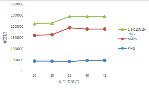 考察不同溫度對(duì)衍生的影響,衍生溫度大于35 ℃時(shí),草甘膦和氨甲基膦酸以及內(nèi)標(biāo)的峰面積無(wú)太大差異,方案中選擇45℃為衍生溫度。