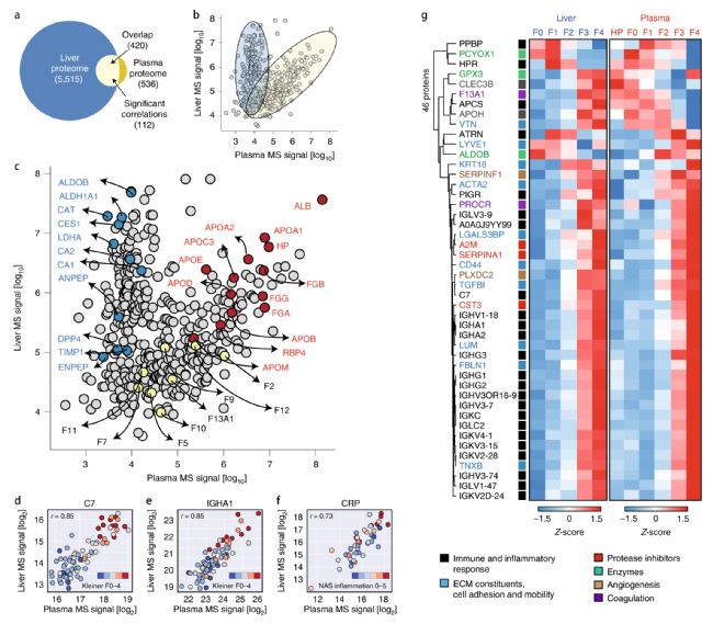 肝臟和血漿中總共有420種蛋白質(zhì)被量化, 他們?cè)诙S空間中的水平表現(xiàn)出雙模態(tài)模式。其中一組蛋白質(zhì),肝臟和血漿的相對(duì)豐度排名在很大程度上是相關(guān)的 (“對(duì)角聚類”),而另一組沒(méi)有相關(guān)性(“垂直聚類”)。相關(guān)性分析顯示,112種蛋白在肝臟和血漿樣本之間存在顯著關(guān)聯(lián)。肝臟和血漿蛋白質(zhì)組的協(xié)方差分析中找到46種共調(diào)控蛋白,功能涉及免疫和炎癥反應(yīng)、細(xì)胞粘附、ECM組織、蛋白酶抑制劑和細(xì)胞內(nèi)酶等。