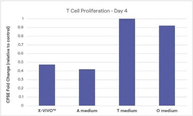 圖1:在X-VIVO、 A、T、O 培養(yǎng)基中培養(yǎng)4天的T細(xì)胞增殖比較。細(xì)胞增殖表現(xiàn)為細(xì)胞+培養(yǎng)基對(duì)照組的CFSE倍數(shù)變化。Donor=3