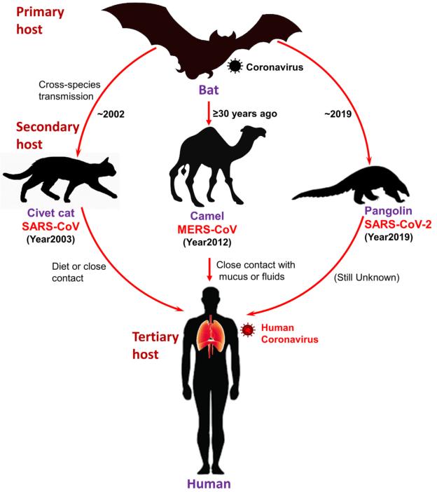 自20世紀30年代末以來,人們就知道了動物冠狀病毒,最近的研究將Human coronaviruses (HCoVs)的進化與加速的城市化和家禽養(yǎng)殖聯(lián)系起來;這些做法允許頻繁的物種交換和簡化物種屏障的跨越,研究人員通過研究SARS-CoV-2和相關sarbecovirus (SARS-CoV-2屬于蝙蝠和穿山甲病毒的病毒群)的突變過程發(fā)現(xiàn)了相當顯著的變化,早在1983年,有證據(jù)強烈表明單峰駱駝是MERS CoV的重要宿主;據(jù)預測,這種祖?zhèn)鞑《緯䦶尿鹕砩峡缭轿锓N屏障,進入單峰駱駝體內(nèi)。后來,穿山甲被認為是SARS-CoV-2的潛在中間宿主,因為它與穿山甲中的CoV具有99%的遺傳同源性;但它們都是在SARS-CoV-2出現(xiàn)在人類之前。這也說明,許多冠狀病毒具有“通才”的特性且在宿主之間跳躍能力明顯,而這一特性使得冠狀病毒可能在傳染給人類之前就已經(jīng)在蝙蝠中得到進化了[1]。