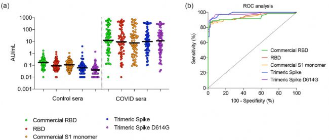 我們特別選擇了一組2019冠狀病毒疾病血清樣本,這些樣本涵蓋了大量SARS-CoV-2特異性抗體濃度。通過對三聚體棘突蛋白和RBD蛋白用于血清學分析中檢測SARS-CoV-2特異性IgG。發(fā)現(xiàn)新冠病毒樣本的中值信號強度比對照樣本高400倍以上(圖5a)。統(tǒng)計分析顯示,S1單體和兩種RBD的ROC之間沒有差異,武漢和D614G三聚體棘突之間也沒有差異。此外,我們的結(jié)果表明,CHO產(chǎn)生的三聚體棘突比S1單體和RBD具有更高的診斷特異性和敏感性。