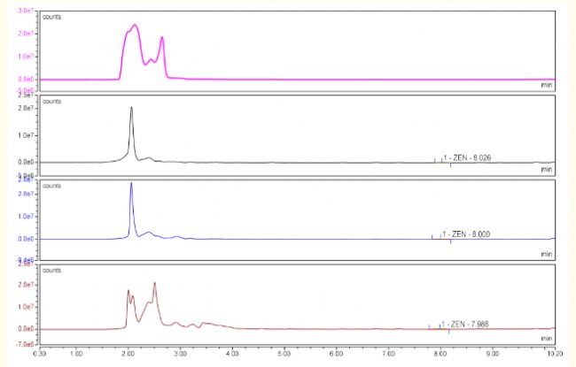 (①玉米粉提取液-未凈化處理/②Copure®224-凈化處理/③國外A品牌-凈化處理/④國內(nèi)B品牌-凈化處理)