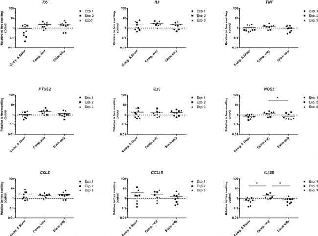 THP1-Blue 單核細(xì)胞在機械負(fù)載 3 天后,與壓縮和剪切的組合以及的單獨剪切相比,單獨壓縮條件顯著上調(diào)促炎標(biāo)志物NOS2和IL12B的基因表達(dá)水平(圖3)。IL6、IL-8、TNF- α、PTGS2、IL-10、CCL2和CCL18的基因表達(dá)水平在加載條件之間或與自由膨脹對照組相比沒有顯著差異。