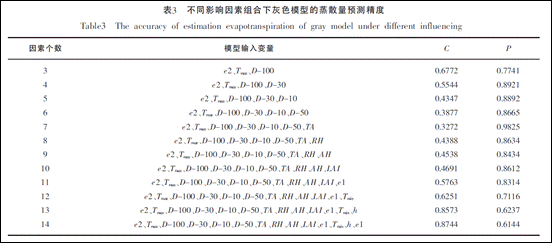 準(zhǔn)確預(yù)測(cè)作物蒸散量對(duì)制定精準(zhǔn)的灌溉制度和提高水分利用率至關(guān)重要。為進(jìn)一步研究識(shí)別氣象要素對(duì)作物蒸散的影響,本文采用五道溝水文實(shí)驗(yàn)站SoilScope控制型蒸滲實(shí)驗(yàn)系統(tǒng)(大型稱重式蒸滲儀)實(shí)測(cè)資料及氣象資料,利用灰色關(guān)聯(lián)法分析了玉米蒸散量與14個(gè)水文氣象要素間的關(guān)聯(lián)度,建立12個(gè)不同影響因素組合下的GM(1,n)逐日蒸散量預(yù)測(cè)模型。結(jié)果表明:淮北平原夏玉米蒸散量與各影響因素的灰色關(guān)聯(lián)度從大到小排序依次為:水汽壓力差>日最高氣溫>地溫100cm>地溫30cm>地溫10cm>地溫50cm>日平均氣溫>相對(duì)濕度>絕對(duì)濕度>葉面積指數(shù)>飽和差>日最低氣溫>日照時(shí)數(shù)>風(fēng)速;不同影響因素組合下的建模結(jié)果表明輸入要素個(gè)數(shù)為4-8時(shí),模型預(yù)測(cè)精度均合格,后驗(yàn)差比值均小于0.45,小誤差概率均大于0.8,可用于蒸散預(yù)測(cè)。采用GM(1,7)模型時(shí),模型精度最高。