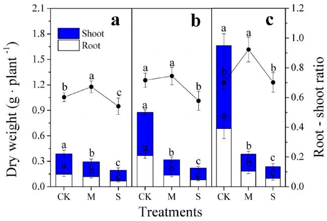 圖1. 干旱對(duì)根生物量、地上生物量和根冠比的影響