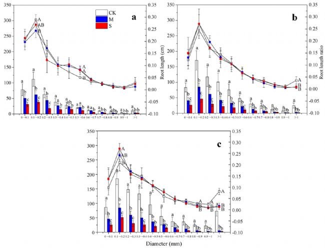 圖4. 不同直徑級(jí)根長(zhǎng)和比根長(zhǎng)