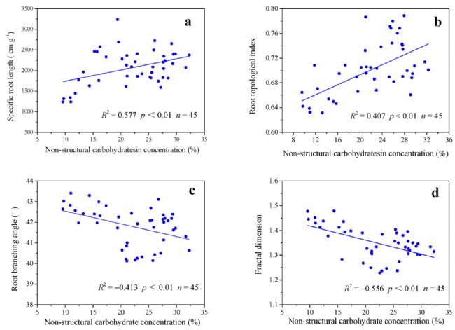 圖6. 非機(jī)構(gòu)性碳水化合物與比根長(zhǎng)、拓?fù)渲笖?shù)、分枝角度和分形維數(shù)間的相關(guān)性