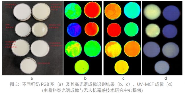 易科泰光譜成像與無人機(jī)遙感技術(shù)研究中心技術(shù)人員使用PhenoTron®高光譜成像分析系統(tǒng),對駱駝鮮奶、蒙古牛泌乳前期鮮奶等進(jìn)行了兌水、摻假檢測等研究,分別采集并分析了不同純度鮮奶的高光譜成像及熒光成像數(shù)據(jù)。結(jié)果顯示,基于高光譜反射及UV-MCF成像,可非接觸、快速、高通量檢測鑒定鮮奶類食品是否存在兌水、摻假等現(xiàn)象,并將結(jié)果可視化呈現(xiàn),為鮮奶品質(zhì)把控提供先進(jìn)的鑒定手段。