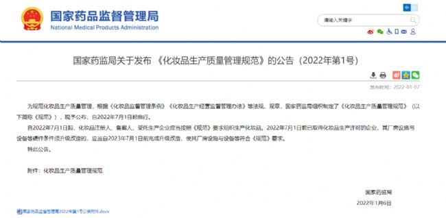 國家藥監(jiān)局2022年第1號公告發(fā)布《化妝品生產質量管理規(guī)范》(以下簡稱“《規(guī)范》”),標志著化妝品監(jiān)管新篇章全面開啟。