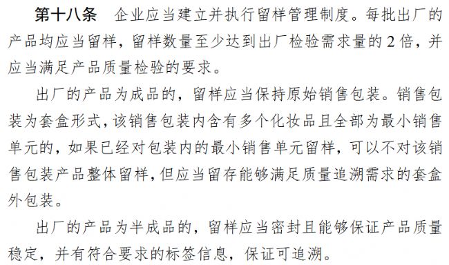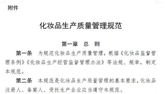 該規(guī)范共9章67條,明確了化妝品生產企業(yè)質量管理機構與人員、質量保證與控制、廠房設施與設備管理、物料與產品管理、生產過程管理、產品銷售管理等要求。