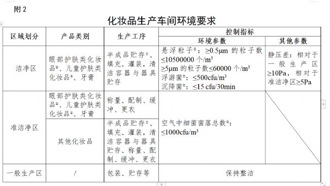 《規(guī)范》還根據各區(qū)域的產品類別和生產工序,將化妝品生產車間分為潔凈區(qū)、準潔凈區(qū)和一般生產區(qū),以環(huán)境參數和其他參數為控制指標對車間環(huán)境做詳細區(qū)分,以保證化妝品的生產安全。