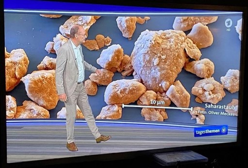 藍(lán)色曲線顯示撒哈拉沙塵暴發(fā)生前不久的粒徑分布。綠色和紅色曲線顯示沙塵事件發(fā)生時的尺寸分布。它們因天氣條件而異。例如,在同時有降水的情況下(綠色曲線),顆粒分布總體上雖然有所增加,但僅在 < 1µm 的范圍內(nèi)---較粗的顆粒被雨水沖刷得更多,因此幾乎不會升高。紅色曲線顯示了沙塵的典型分布, 1-10 µm 范圍內(nèi)顆粒明顯增加。在從撒哈拉沙漠穿越南歐到北歐的漫長旅程中,撒哈拉沙漠的塵埃和氣溶膠粒徑分布也因當(dāng)?shù)靥鞖鈼l件而發(fā)生變化。