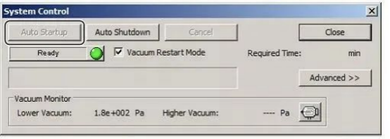 在“系統(tǒng)控制(System Control)”模塊中點擊“自動開機(Auto Startup)”,機械泵和分子渦輪泵啟動,等待真空穩(wěn)定(建議等待12小時以上)