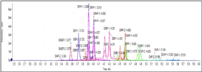 圖6. 23種鄰苯二甲酸酯類化合物MRM提取離子流色譜圖