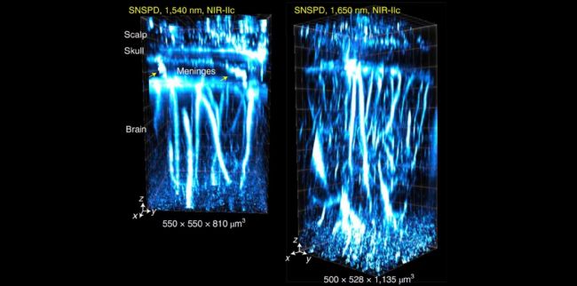 作者首先成像充滿水懸浮液的50-μm直徑毛細(xì)管,使用發(fā)射峰值在NIR-IIb的P3-QDb或NIR-IIc的P3-QDc,浸在5%脂質(zhì)溶液內(nèi),模擬小鼠腦組織的血管。SNSPD的SBR,分辨率比InGaAs相機(jī)高,NIR-IIc的波長下, SNSPD可以實(shí)現(xiàn)更深深度的成像,1650nm激發(fā)下,可在4.4mm下分辨毛細(xì)管,比1540nm激發(fā)NIR-IIc成像和1319nm激發(fā)NIR-IIb成像更深。(圖2a-c)1900nm以上的熒光信號(hào)隨著水層的增加而減少,說明水對(duì)熒光吸收的影響。(圖2d)