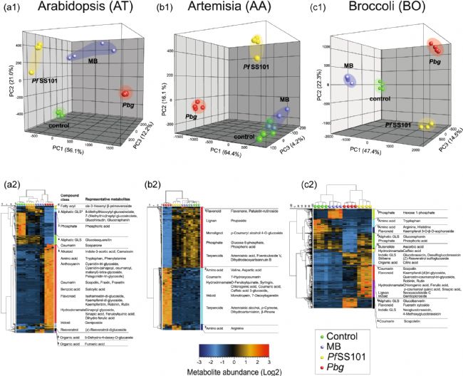 Pbg對青蒿和擬南芥的幼苗代謝組的影響最大,分別代表了最有效和最無效的伙伴關(guān)系。此外,大部分差異代謝物是接種