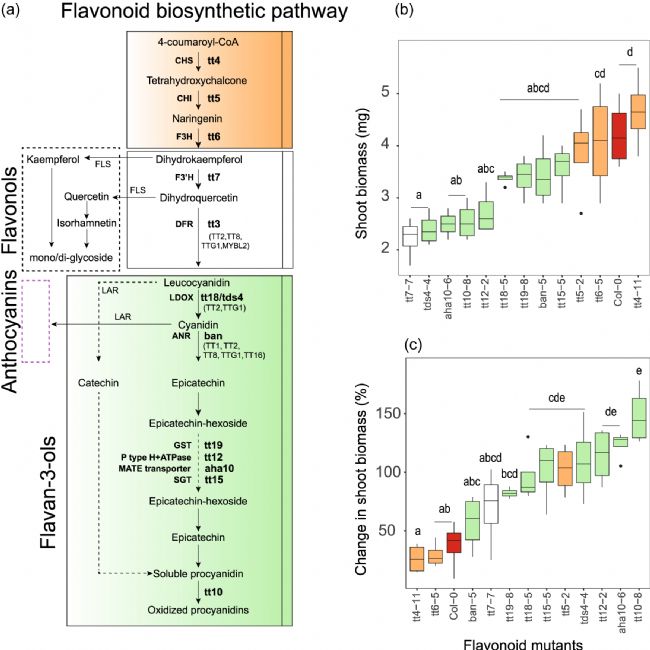 tt)突變體生長的影響,這些突變體在類黃酮途徑不同分支的生物合成中的基因被破壞。在沒有