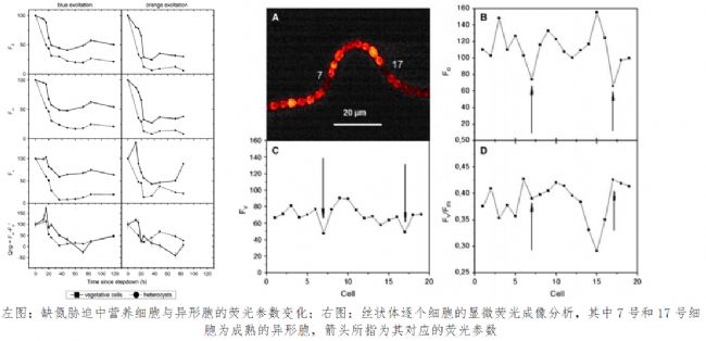 Anabaena sp. strain PCC 7120異形胞進(jìn)行更深入研究。研究人員明確觀測到隨著氮素缺乏脅迫程度的加重,絲狀體細(xì)胞開始分化,營養(yǎng)細(xì)胞和異形胞的葉綠素參數(shù)F
