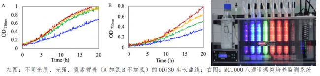 Anabaena 33047進(jìn)行處理。通過MC1000八通道藻類培養(yǎng)監(jiān)測系統(tǒng)模擬不同波長的高光培養(yǎng)環(huán)境,同步實(shí)時(shí)監(jiān)測其OD730,表明這種藍(lán)藻可以在高光條件下具有良好的適應(yīng)性。