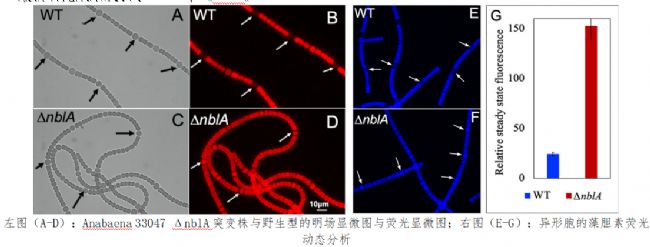 通過特殊定制的FKM系統(tǒng),研究人員直接測量了營養(yǎng)細(xì)胞和異形胞的藻膽素?zé)晒。結(jié)果表明, Anabaena 33047 ΔnblA突變株中異形胞的藻膽素?zé)晒馀c營養(yǎng)細(xì)胞接近,但野生型異形胞則遠(yuǎn)遠(yuǎn)低于影響細(xì)胞。通過FKM熒光動(dòng)態(tài)分析,ΔnblA突變株異形胞的藻膽素?zé)晒馐且吧彤愋伟拇蠹s8倍高。這樣高含量的藻膽素,也就表明其可以為固氮過程提供遠(yuǎn)高于野生型的ATP,顯著提高其固氮能力。這一最新研究成果發(fā)表于2021年《mBio》。