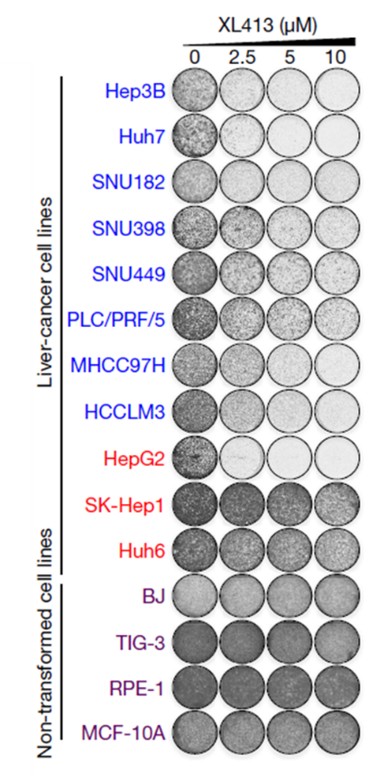 利用濃度增加的XL413處理了一組未轉(zhuǎn)化細(xì)胞和肝癌細(xì)胞系。TP53突變的肝癌細(xì)胞系的增殖受損,而野生型TP53(SK-Hep1和Huh6細(xì)胞)的肝癌細(xì)胞系以及所有四種未轉(zhuǎn)化細(xì)胞系對(duì)XL413均不敏感,利用Incucyte® 實(shí)時(shí)活細(xì)胞成像系統(tǒng)實(shí)時(shí)監(jiān)測(cè)不同細(xì)胞系的克隆形成(圖2),更容易發(fā)現(xiàn)TP53突變狀態(tài)與對(duì)CDC7的抑制作用之間的因果關(guān)系。XL413的抗增殖作用與TP53突變的肝癌細(xì)胞中衰老標(biāo)記物的誘導(dǎo)有關(guān),但與野生型TP53的肝癌細(xì)胞或非轉(zhuǎn)化細(xì)胞中的衰老標(biāo)記物無(wú)關(guān),并且在TP53突變的肝癌細(xì)胞中,XL413使衰老標(biāo)記物14富集。同時(shí)發(fā)現(xiàn),CDC7的敲除會(huì)損害TP53突變的肝癌細(xì)胞的增殖和誘導(dǎo)衰老,但對(duì)野生型TP53的細(xì)胞沒有影響。