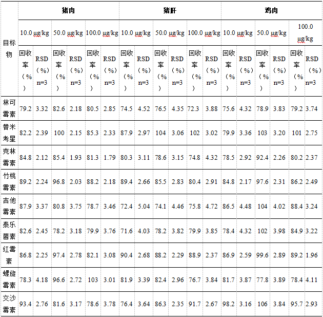本方法以QuEChERS為凈化手段,選擇雞肉、豬肉和豬肝為代表,對禽肉、畜肉和動物內(nèi)臟三種類型的基質(zhì)做了三個不同水平加標(biāo)驗證,回收率滿足70%~106%,RSD<10%,符合使用要求,可供客戶選擇。
