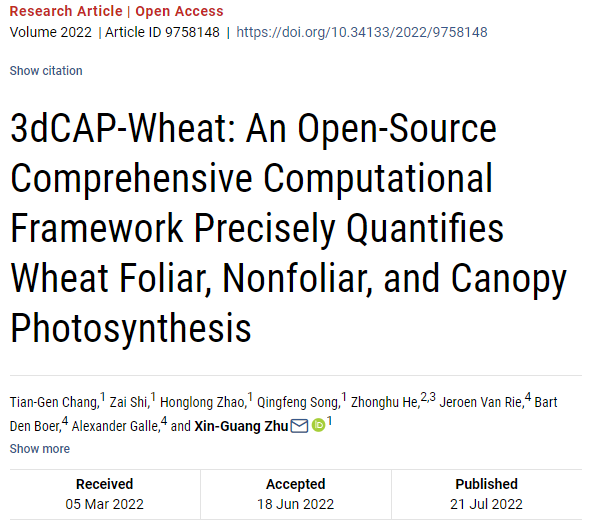 近日,Plant Phenomics在線發(fā)表了中科院分子卓越創(chuàng)新中心朱新廣團(tuán)隊(duì)題為3dCAP-wheat: a computational framework quantifies wheat foliar, non-foliar and canopy photosynthesis 的研究論文,建立了一個(gè)完整的小麥冠層光合模型,第一實(shí)現(xiàn)了對(duì)小麥葉片組織、非葉組織光合和整個(gè)冠層光合速率的量化計(jì)算,從而為小麥高光效研究提供了核心研究工具。