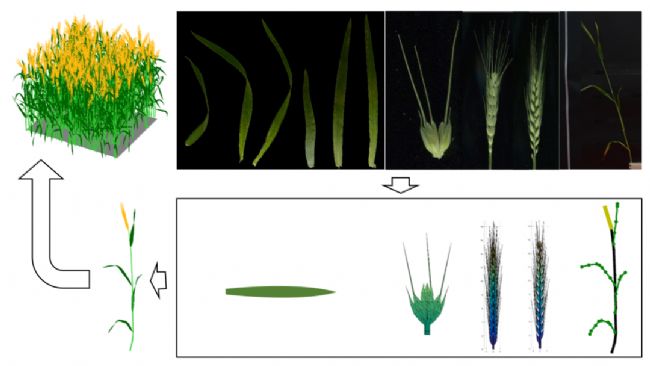 首先,研究者們構(gòu)建了小麥各個(gè)地上部組織(葉片、莖稈、麥穗)的三維結(jié)構(gòu)模型,并根據(jù)二維圖像還原出器官、分蘗和冠層的數(shù)字三維結(jié)構(gòu)(圖1)。