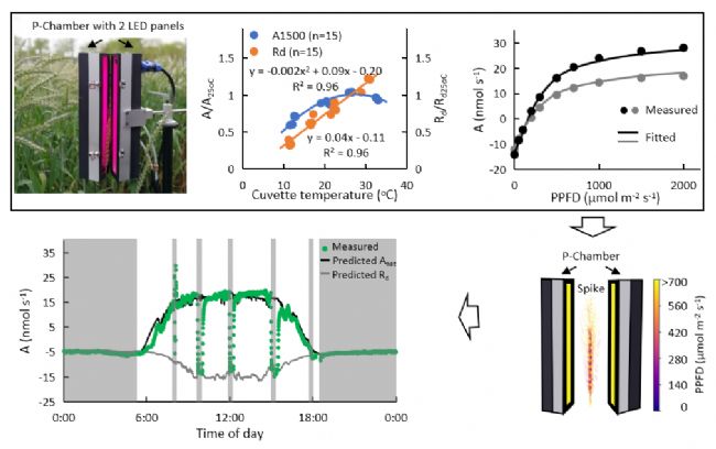 為了克服植物非葉組織光合作用刻畫的瓶頸,研究者們研發(fā)了針對(duì)非葉組織不規(guī)則外形特點(diǎn)的光合作用測(cè)量設(shè)備(P-Chamber;圖2),并提出了基于三維結(jié)構(gòu)建模的植物非葉組織的光合特征刻畫方案,從而首次實(shí)現(xiàn)了對(duì)作物群體中的非葉組織全天不同時(shí)刻光合速率的非破壞性原位精確模擬計(jì)算(圖2)。