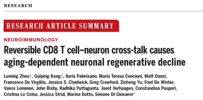 軸突再生和神經(jīng)功能恢復(fù)在老年人群中極為有限。因此,老年人的神經(jīng)系統(tǒng)損傷通常會(huì)導(dǎo)致嚴(yán)重且長(zhǎng)期的殘疾。衰老能夠引起細(xì)胞信號(hào)傳導(dǎo)的廣泛變化,包括代謝、免疫和整體組織穩(wěn)態(tài)的變化,在神經(jīng)系統(tǒng)生理學(xué)和對(duì)損傷的反應(yīng)中發(fā)揮了關(guān)鍵作用。目前,我們對(duì)衰老依賴的再生失敗的分子機(jī)制的理解仍然很差,嚴(yán)重阻礙了神經(jīng)修復(fù)療法的發(fā)展,因此,迫切需要確定老化導(dǎo)致再生失敗的關(guān)鍵分子和細(xì)胞機(jī)制。2022年5月13日,英國(guó)帝國(guó)理工大學(xué)的研究人員在《Science》雜志上發(fā)表題為“Reversible CD8 T cell neuron cross-talk causes aging-dependent neuronal regenerative decline”的文章,該研究發(fā)現(xiàn)了一種衰老依賴的軸突再生衰退的細(xì)胞分子機(jī)制,依賴于趨化因子CXCL13進(jìn)行募集和激活的CXCR5+ CD8+ T細(xì)胞,在與受損后過表達(dá)主要組織相容性復(fù)合體Ⅰ類(Major Histocompatibility Complex Ⅰ, MHC Ⅰ)的DRG神經(jīng)元交流后,會(huì)限制軸突再生。此外,作者利用人源化單克隆抗體對(duì)CXCL13的拮抗作用,成功逆轉(zhuǎn)衰老小鼠的神經(jīng)再生衰退并促進(jìn)了神經(jīng)系統(tǒng)的恢復(fù),這些結(jié)果揭示了一種可用于未來治療的潛在途徑。