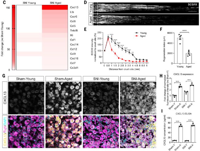 1、衰老與小鼠SNI損傷后DRG中T細(xì)胞活化信號(hào)的顯著升高有關(guān),這些淋巴活化信號(hào)激活了轉(zhuǎn)錄因子NF-κB,誘導(dǎo)神經(jīng)元表達(dá)趨化因子CXCL13;