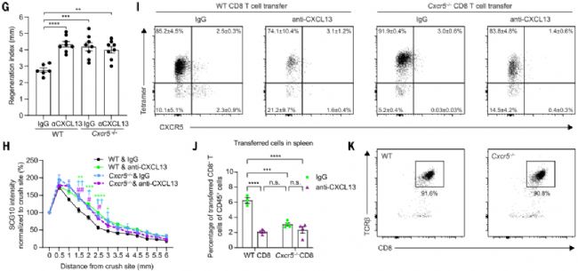 8. CXCL13拮抗劑阻斷CXCR5+ CD8+ T細(xì)胞的募集,挽救了SNI傷后衰老依賴的軸突再生衰退已經(jīng)證明CXCR5+ CD8+ T細(xì)胞的募集會(huì)導(dǎo)致軸突再生失敗,作者探究了這些細(xì)胞是如何募集的。將分選的野生型CD8+ T細(xì)胞或Cxcr5-/- CD8+ T細(xì)胞移植到OT-I Rag2-/-小鼠體內(nèi),小鼠在SNI手術(shù)前用對(duì)照免疫球蛋白G或CXCL13單克隆抗體處理。DRG中Cxcr5-/- CD8+ T細(xì)胞的募集明顯低于野生型CD8+ T細(xì)胞。CXCL13單克隆抗體顯著降低了CXCR5+ CD8+ T細(xì)胞向DRG以及脾臟的遷移。CXCL13拮抗顯著增強(qiáng)了移植野生型CD8+ T細(xì)胞而非移植Cxcr5-/- CD8+ T細(xì)胞小鼠的SNI后軸突再生能力。因此,在衰老DRG中,CD8+ T細(xì)胞的遷移和限制坐骨神經(jīng)再生需要依賴CXCL13作用于其受體CXCR5。