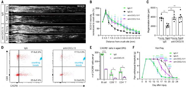 因此,DRG神經(jīng)元表達(dá)的CXCL13可以招募CXCR5+ B細(xì)胞和T細(xì)胞,并可以抑制軸突再生,部分復(fù)制了衰老表型。