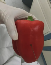 比如這個(gè)彩椒,直接刮取表面,就完成了取樣,現(xiàn)場(chǎng)最快 20 秒即可出具檢測(cè)結(jié)果,農(nóng)殘不合格者直接現(xiàn)場(chǎng)就處理。
