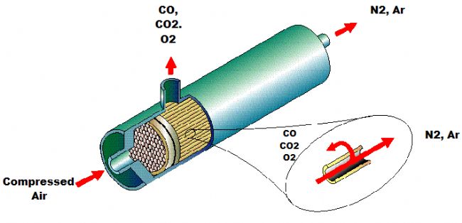 將壓縮空氣通過中空的纖維膜管束,氧氣、二氧化碳等成分會(huì)通過纖維膜管道上的小孔,排到大氣中去,氮?dú)夂蜆O少量的氬氣會(huì)被收集起來(lái),經(jīng)過一系列的凈化后,輸送到應(yīng)用設(shè)備。這種氮?dú)夥蛛x提取技術(shù)簡(jiǎn)單有效,無(wú)需任何移動(dòng)部件。