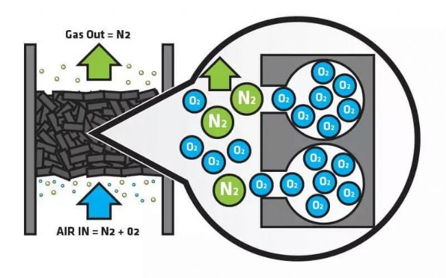 變壓吸附制氮的填充材料是碳分子篩,是一種多孔疏松的棒狀碳顆粒,當(dāng)壓縮空氣通過碳分子篩時(shí),根據(jù)氣體分子直徑的不同,碳分子篩會(huì)吸附氧氣,但是,氮?dú)獠粫?huì)被吸附,從而被分離。變壓吸附的過程包括吸附-解壓-重生階段。