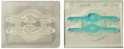 圖2 左:打印Pluronic F-127后的模型;右:降溫去除犧牲材料后,使用染色的PBS進(jìn)行灌注的效果