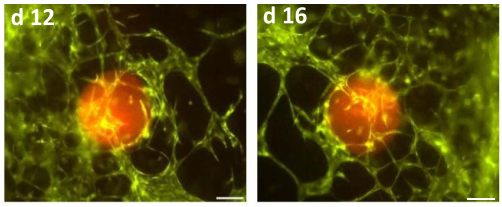 之后作者在打印過(guò)程中將患者來(lái)源的神經(jīng)母細(xì)胞瘤球狀體添加到基質(zhì)里,并培養(yǎng)超過(guò)兩周的時(shí),成功展示了微血管被腫瘤球狀體吸引并生長(zhǎng)的過(guò)程(圖3);而腫瘤球狀體一旦破裂或無(wú)法維持球狀,則腫瘤細(xì)胞會(huì)很快入侵周圍的微環(huán)境(圖4)。