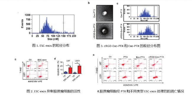 (1)利用干細(xì)胞 EVs 作為載體遞送藥物用于疾病治療是目前較為常見(jiàn)的研究類型。上海第六人民醫(yī)院 Zhu 等嘗試在胚胎干細(xì)胞來(lái)源的外泌體內(nèi)加載紫杉醇(paclitaxel, PTX)用于惡性腦膠質(zhì)瘤的治療并取得一定的成功。研究中對(duì)胚胎干細(xì)胞外泌體粒徑、活性、以及藥物的裝載效率等物理生化性質(zhì)的進(jìn)行分析。發(fā)現(xiàn),胚胎干細(xì)胞來(lái)源的外泌體對(duì)膠質(zhì)瘤細(xì)胞具有抑制作用。并且通過(guò)工程化手段對(duì)外泌體進(jìn)行修飾(修飾 cRGDyK 肽段)使其能夠靶向腫瘤組織,通過(guò)納米流式檢測(cè)儀直觀的觀察到修飾前后外泌體的粒徑變化。同時(shí)在外泌體內(nèi)部裝載紫杉醇藥物后,可提高外泌體抗膠質(zhì)瘤的能力,為治療惡性膠質(zhì)瘤和其他類型腫瘤疾病的研究提供新的思路。下圖是借助納米流式檢測(cè)儀 (NanoFCM) 發(fā)表的部分研究結(jié)果。