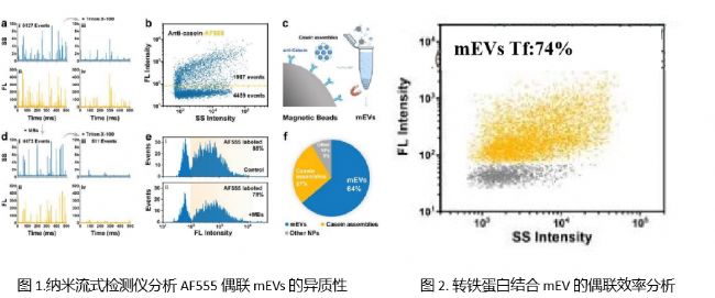 圖3. mEVs異質(zhì)性及轉(zhuǎn)鐵蛋白結(jié)合mEVs的偶聯(lián)效率分析
