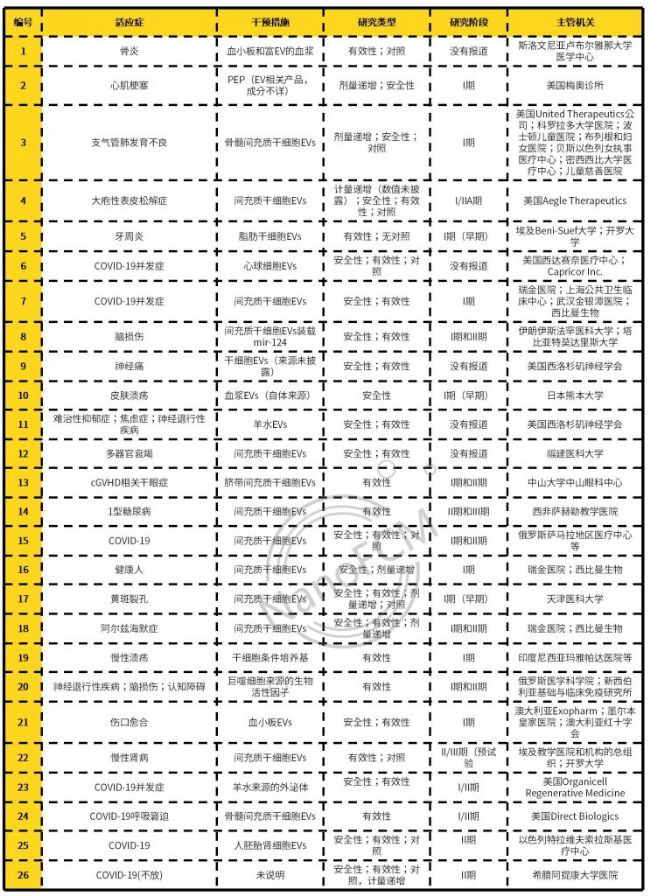 表1.目前針對(duì)不同系統(tǒng)的EVs再生治療案例