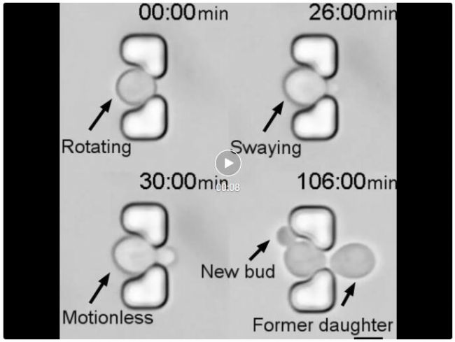 接下來,研究人員在高通量單細胞長時間培養(yǎng)過程中,通過視頻拍攝觀測并驗證了母細胞在初始出芽時的動態(tài)旋轉(zhuǎn),并在芽稍大時重新定向至“瓶頸”處,且停止旋轉(zhuǎn)直到胞質(zhì)分裂完成后被解剖分離。通過時序成像,驗證了母細胞在多代子細胞之間,面臨隨機的出芽位點依然能夠?qū)崿F(xiàn)穩(wěn)定的“瓶頸”定向和子細胞剪切。